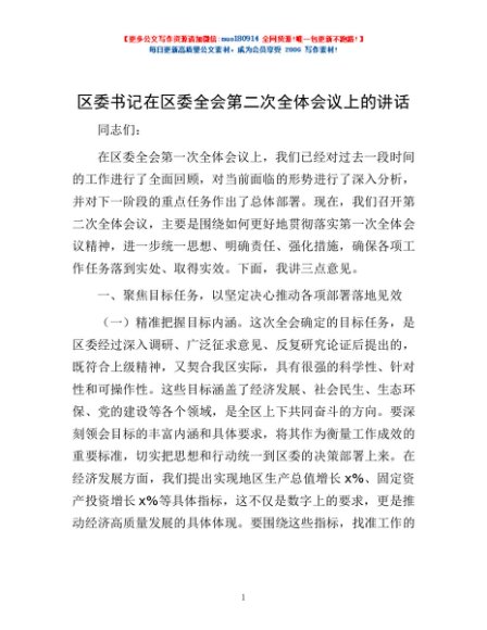 / 区委书记在区委全会第二次全体会议上的讲话