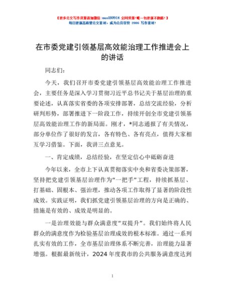 / 在市委党建引领基层高效能治理工作推进会上的讲话