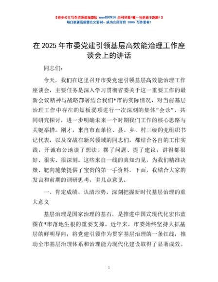 / 在2025年市委党建引领基层高效能治理工作座谈会上的讲话