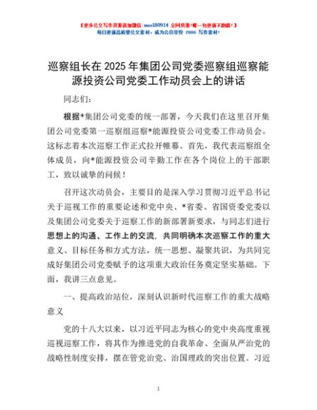 / 巡察组长在2025年集团公司党委巡察组巡察能源投资公司党委工作动员会上的讲话
