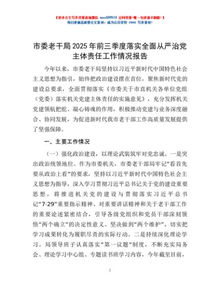 / 市委老干局2025年前三季度落实全面从严治党主体责任工作情况报告