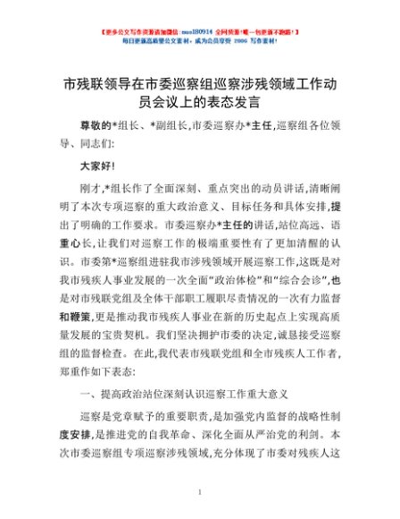 / 市残联领导在市委巡察组巡察涉残领域工作动员会议上的表态发言