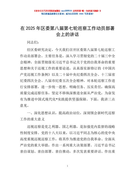/ 在2025年区委第八届第七轮巡察工作动员部署会上的讲话