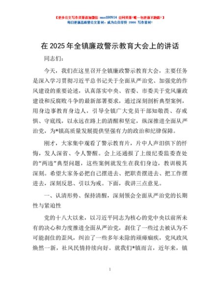 / 在2025年全镇廉政警示教育大会上的讲话