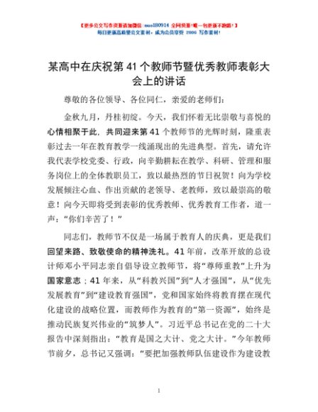 / 某高中在庆祝第41个教师节暨优秀教师表彰大会上的讲话