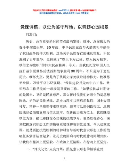 / 党课讲稿:以史为鉴守阵地、以魂铸心固根基
