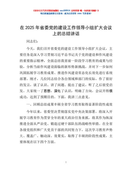 / 在2025年省委党的建设工作领导小组扩大会议上的总结讲话