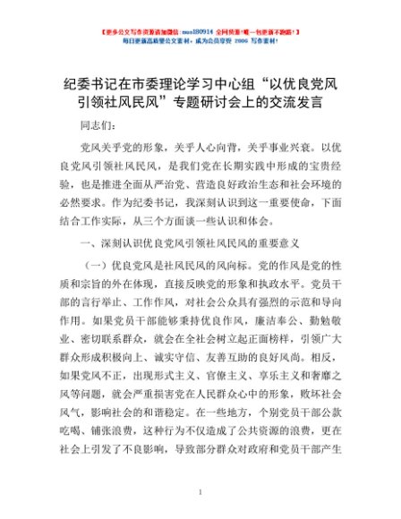/ 纪委书记在市委理论学习中心组“以优良党风引领社风民风”专题研讨会上的交流发言