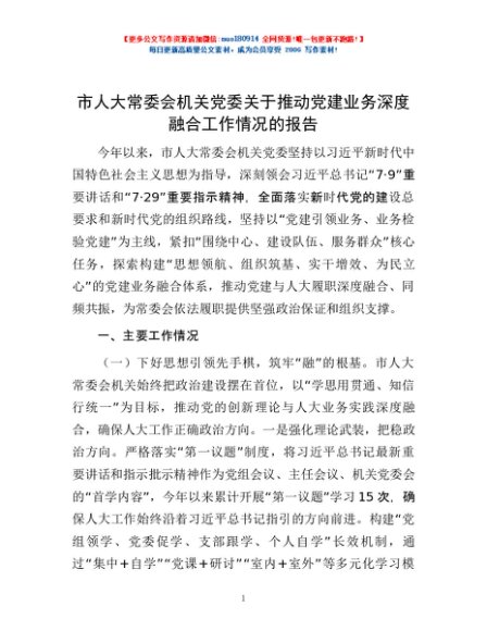 / 市人大常委会机关党委关于推动党建业务深度融合工作情况的报告