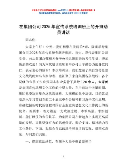/ 在集团公司2025年宣传系统培训班上的开班动员讲话