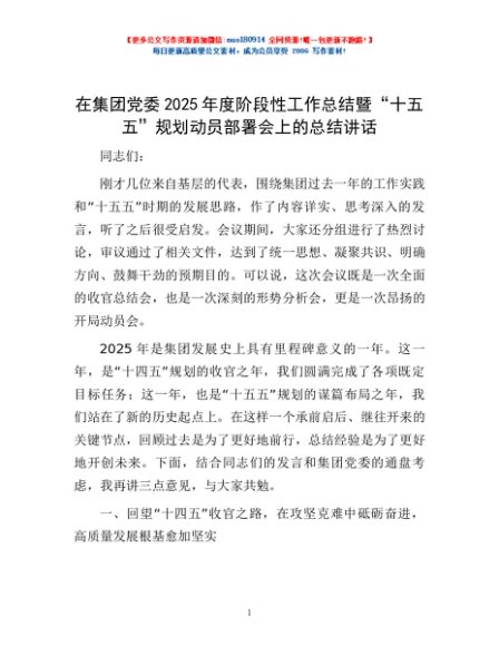 / 在集团党委2025年度阶段性工作总结暨“十五五”规划动员部署会上的总结讲话