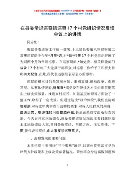 / 在县委常规巡察组巡察17个村党组织情况反馈会议上的讲话
