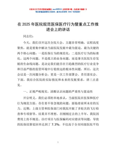 / 在2025年医院规范医保医疗行为暨重点工作推进会上的讲话