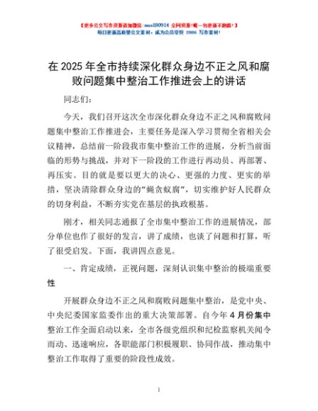 / 在2025年全市持续深化群众身边不正之风和腐败问题集中整治工作推进会上的讲话