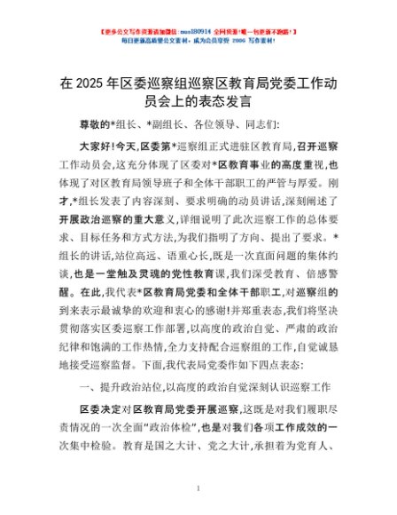/ 在2025年区委巡察组巡察区教育局党委工作动员会上的表态发言