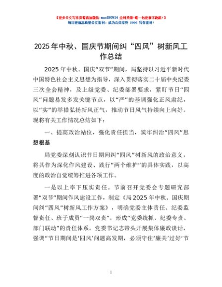 / 2025年中秋、国庆节期间纠“四风”树新风工作总结