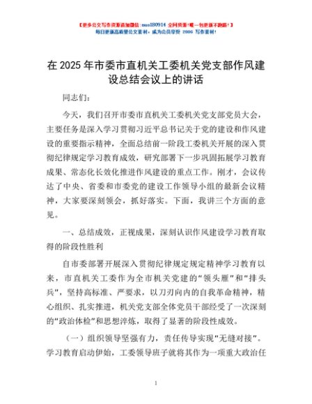 / 在2025年市委市直机关工委机关党支部作风建设总结会议上的讲话