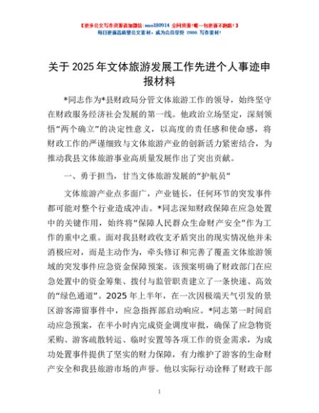 / 关于2025年文体旅游发展工作先进个人事迹申报材料
