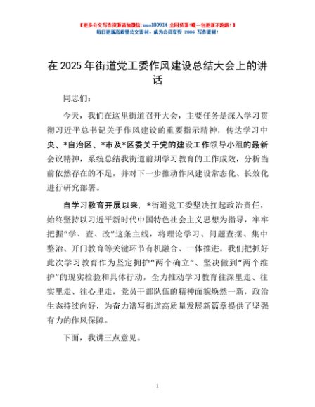 / 在2025年街道党工委作风建设总结大会上的讲话