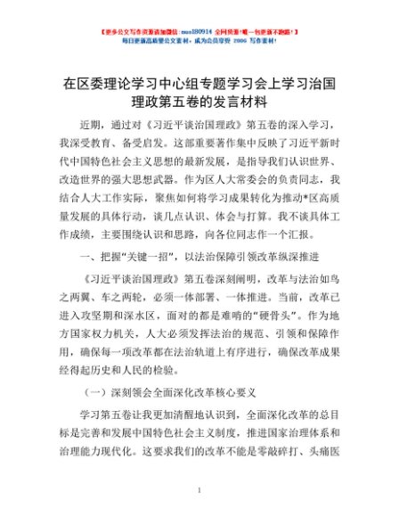 / 在区委理论学习中心组专题学习会上学习治国理政第五卷的发言材料
