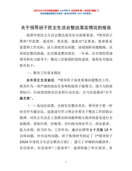 / 关于领导班子民主生活会整改落实情况的报告