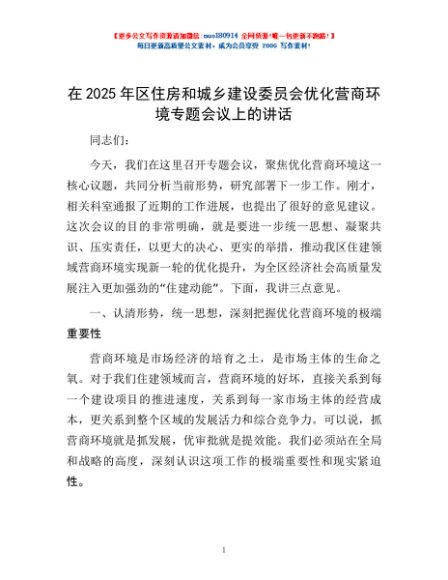 / 在2025年区住房和城乡建设委员会优化营商环境专题会议上的讲话