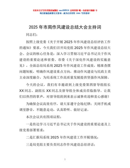 / 2025年市局作风建设总结大会主持词