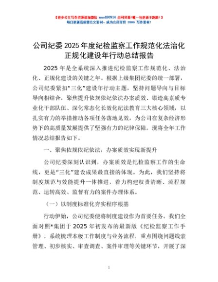 / 公司纪委2025年度纪检监察工作规范化法治化正规化建设年行动总结报告