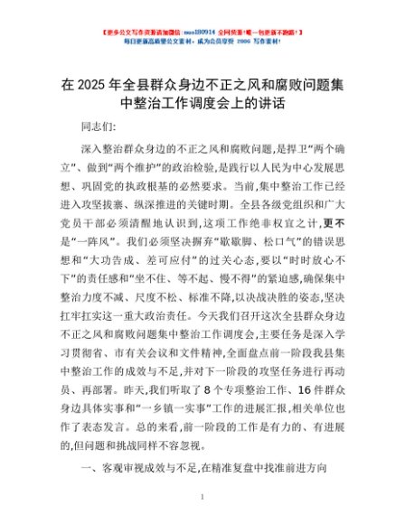 / 在2025年全县群众身边不正之风和腐败问题集中整治工作调度会上的讲话