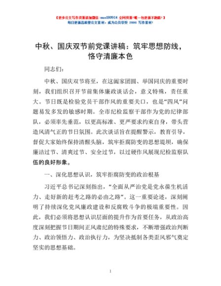 / 中秋、国庆双节前党课讲稿:筑牢思想防线,恪守清廉本色