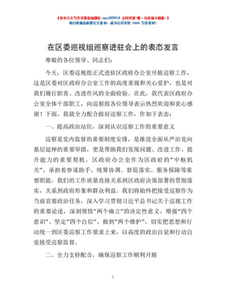 / 在区委巡视组巡察进驻会上的表态发言