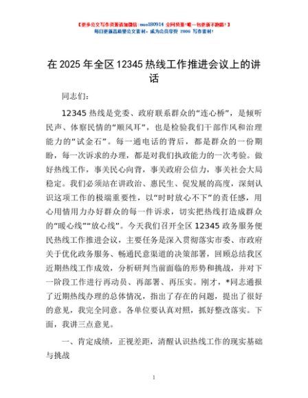/ 在2025年全区12345热线工作推进会议上的讲话