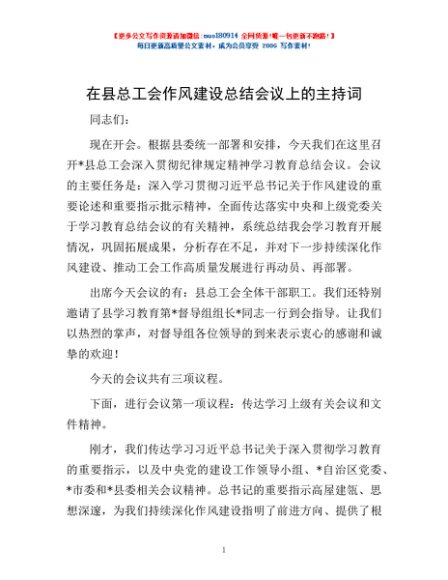 / 在县总工会作风建设总结会议上的主持词