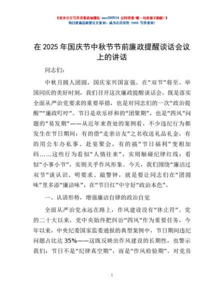 / 在2025年国庆节中秋节节前廉政提醒谈话会议上的讲话