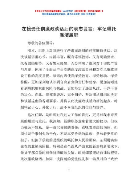/ 在接受任前廉政谈话后的表态发言:牢记嘱托 廉洁履职