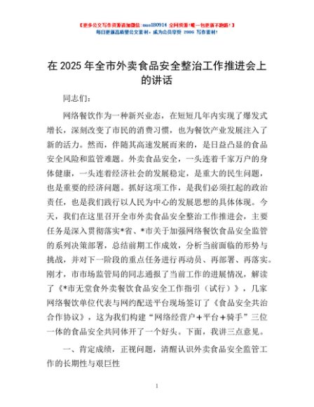 / 在2025年全市外卖食品安全整治工作推进会上的讲话