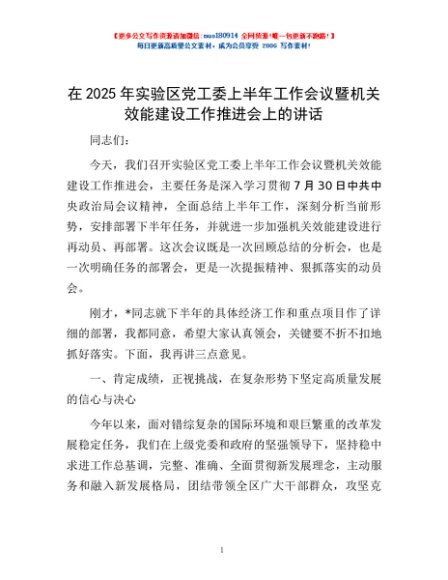/ 在2025年实验区党工委上半年工作会议暨机关效能建设工作推进会上的讲话