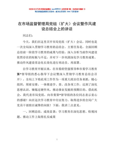 / 在市场监督管理局党组(扩大)会议暨作风建设总结会上的讲话