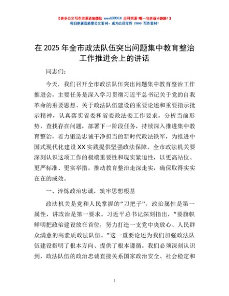 / 在2025年全市政法队伍突出问题集中教育整治工作推进会上的讲话