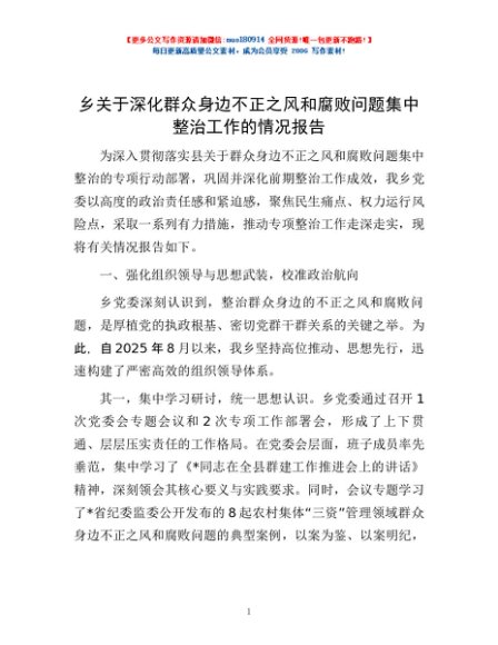 / 乡关于深化群众身边不正之风和腐败问题集中整治工作的情况报告