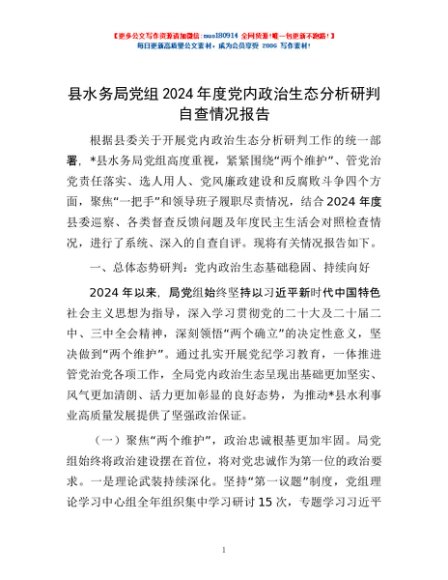 / 县水务局党组2024年度党内政治生态分析研判自查情况报告
