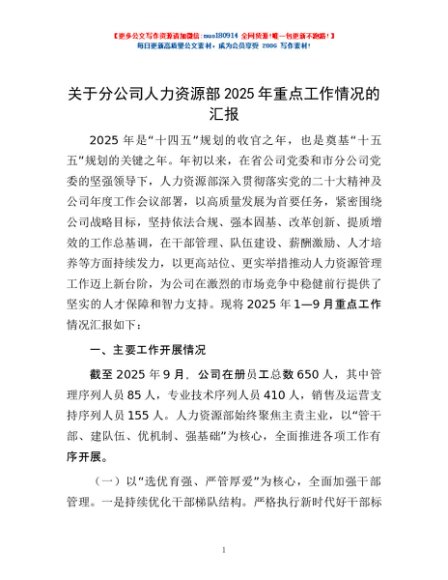 / 关于分公司人力资源部2025年重点工作情况的汇报
