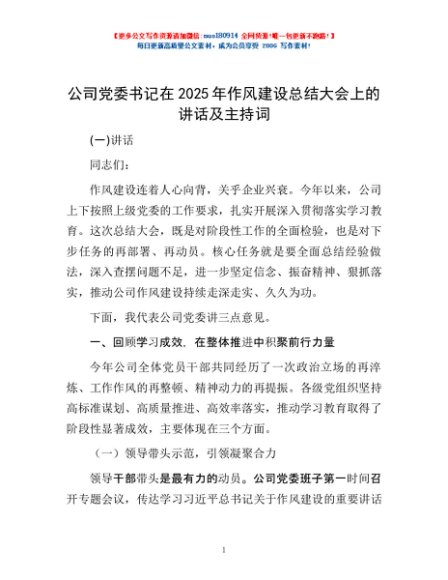 / 公司党委书记在2025年作风建设总结大会上的讲话及主持词