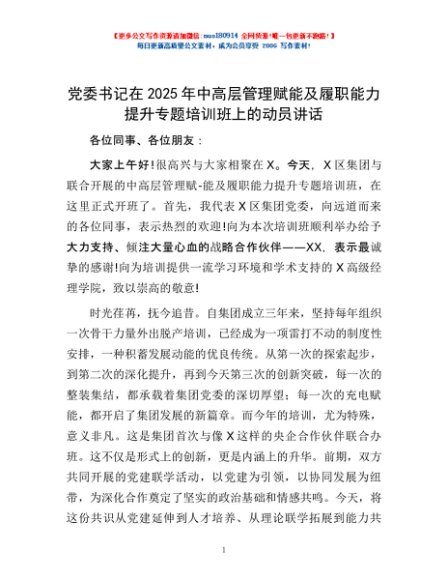 / 党委书记在2025年中高层管理赋能及履职能力提升专题培训班上的动员讲话