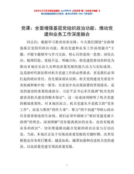 / 党课:全面增强基层党组织政治功能、推动党建和业务工作深度融合