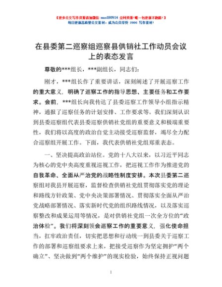 / 在县委第二巡察组巡察县供销社工作动员会议上的表态发言