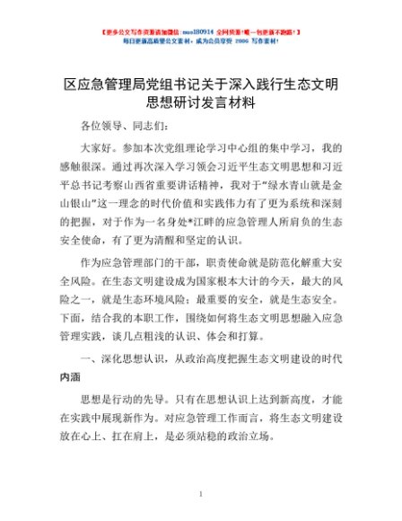 / 区应急管理局党组书记关于深入践行生态文明思想研讨发言材料