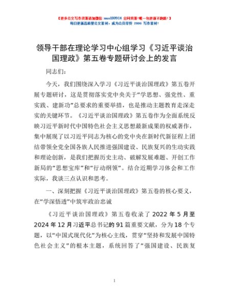 / 领导干部在理论学习中心组学习《习近平谈治国理政》第五卷专题研讨会上的发言