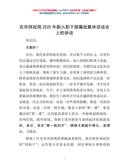 / 在市财政局2025年新入职干部廉政集体谈话会上的讲话