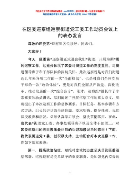 / 在区委巡察组巡察街道党工委工作动员会议上的表态发言